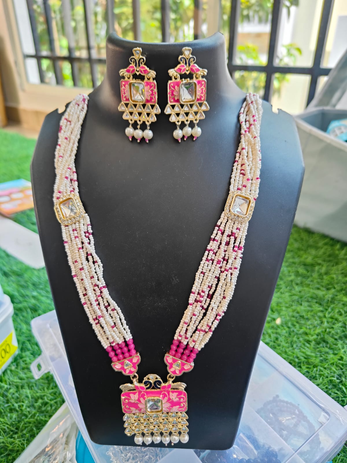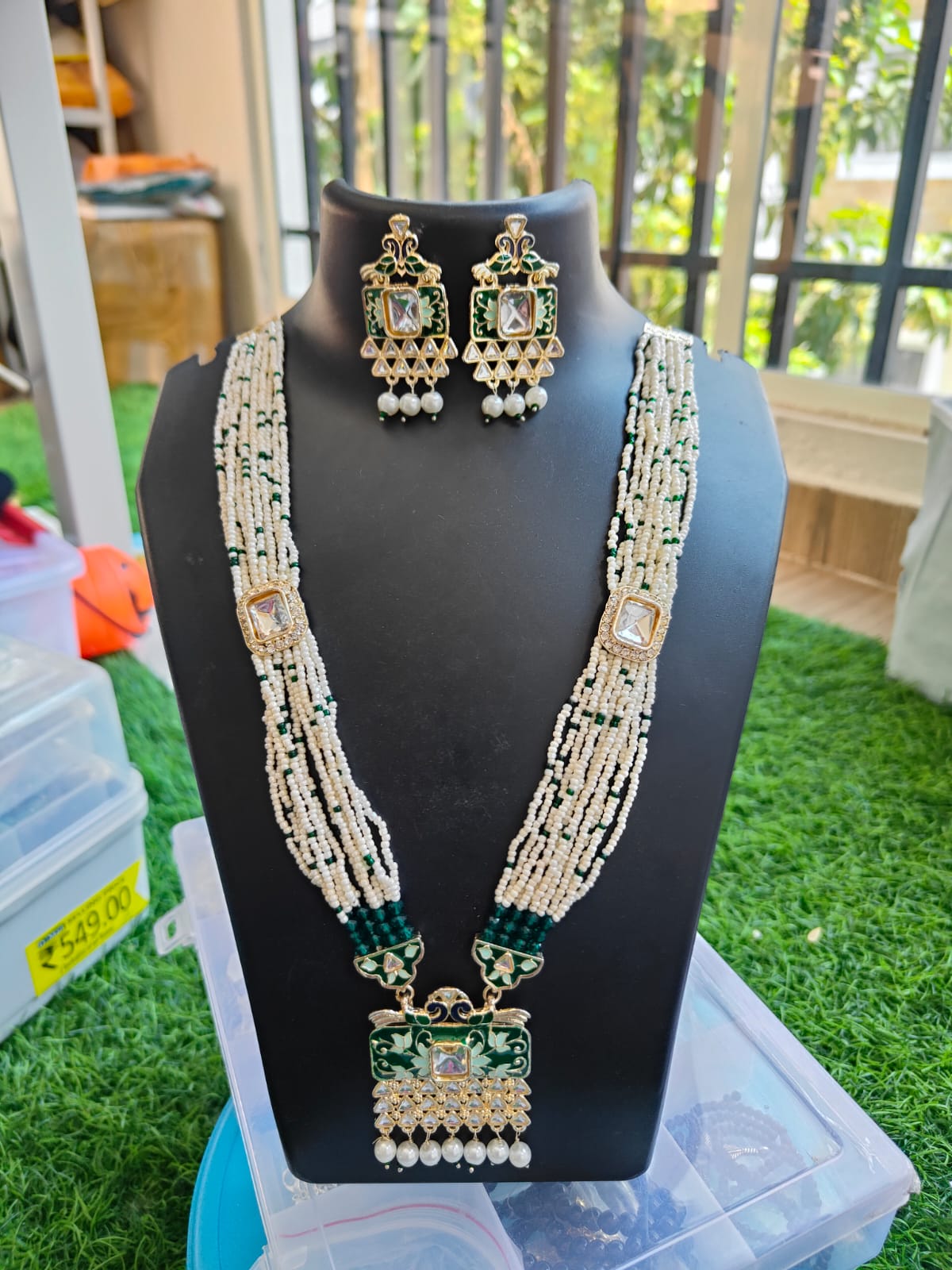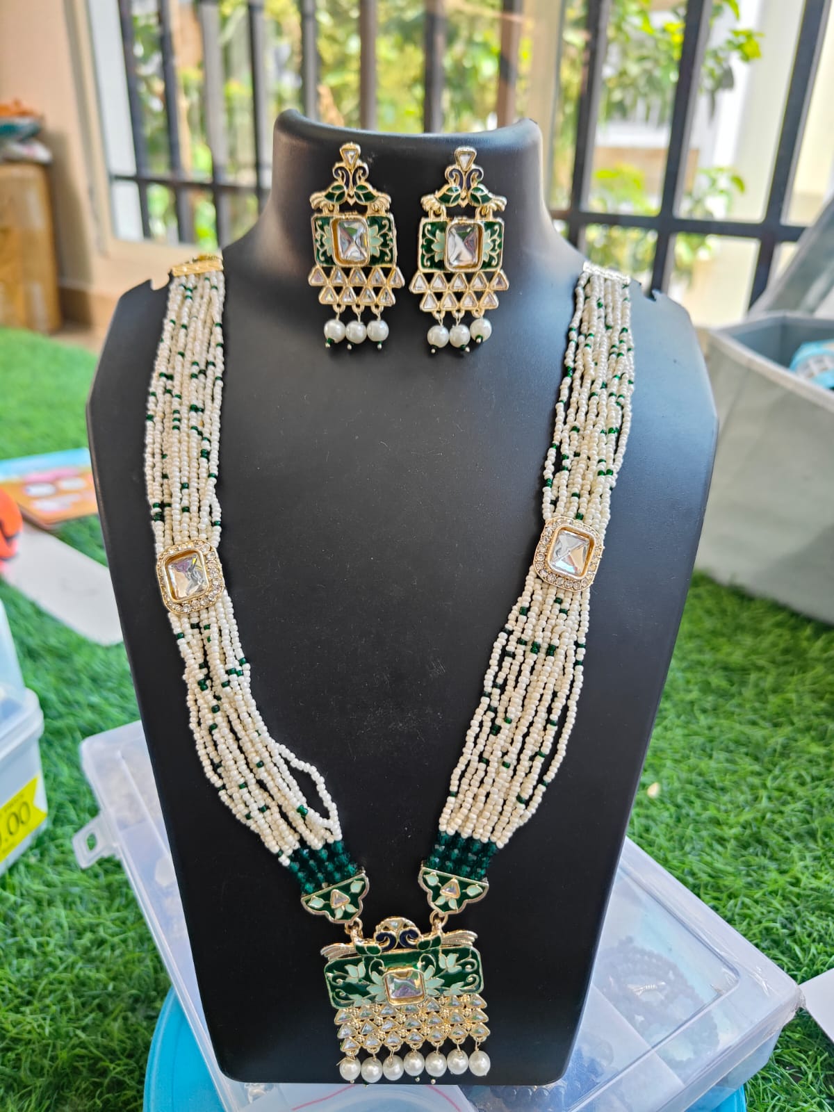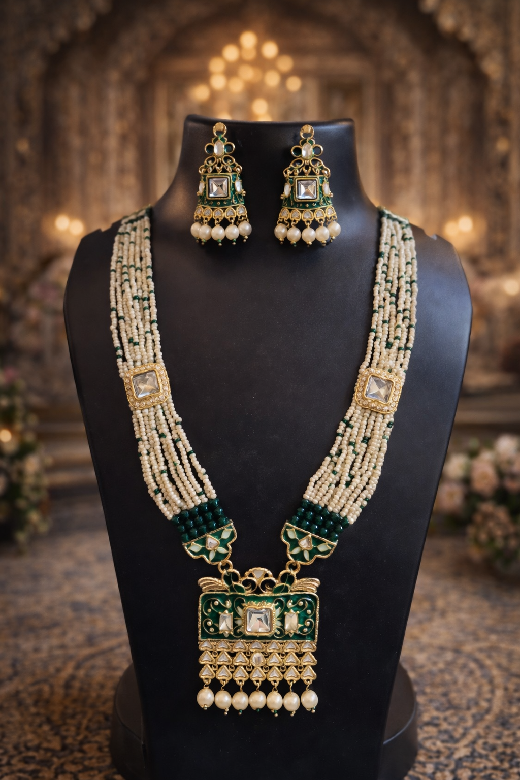 Elevate your style with our handcrafted green beaded neck set, featuring a multi‑strand necklace adorned with pearls and green beads. The centerpiece pendant showcases exquisite enamel artistry with gold detailing, a central gemstone, and delicate pearl drops. Matching earrings mirror the pendant’s intricate design, creating a regal and coordinated look. Crafted with anti‑tarnish quality and premium finishing, this jewelry set is perfect for weddings, festive occasions, or gifting.