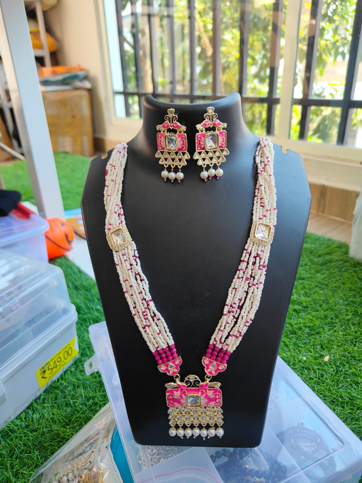 - Design: Multi‑strand necklace with rectangular enamel pendant and gemstone center